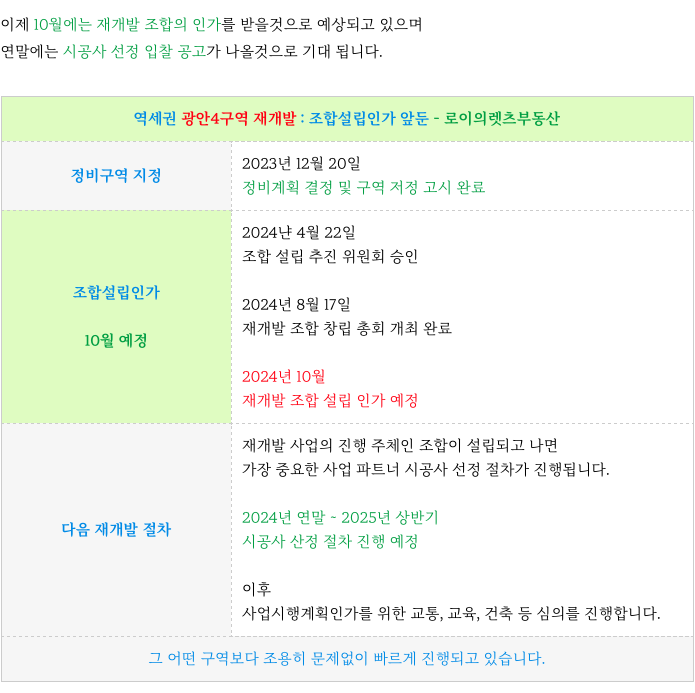 역세권 광안4구역 재개발 : 소액 급매 매물 & 10월조합 설립 인가 예정, 일정