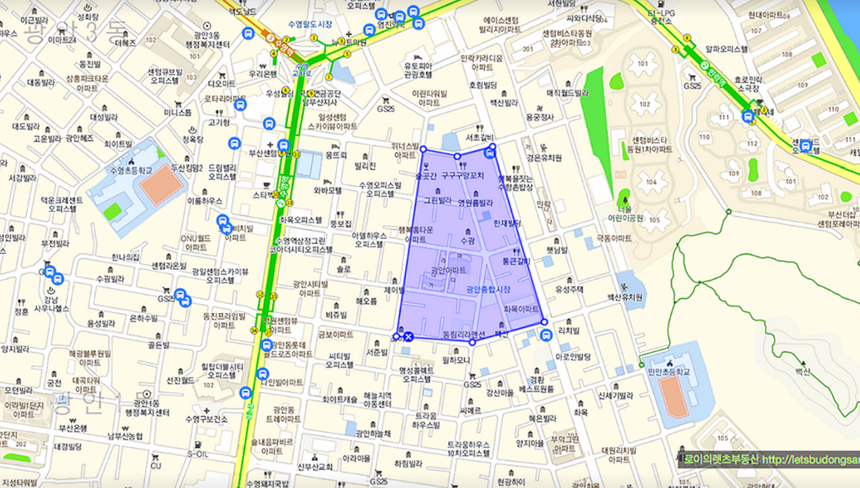 실거주 좋고 교통 좋아 공동주택이 많은 광안동의 여러 재개발 구역과 동일하게