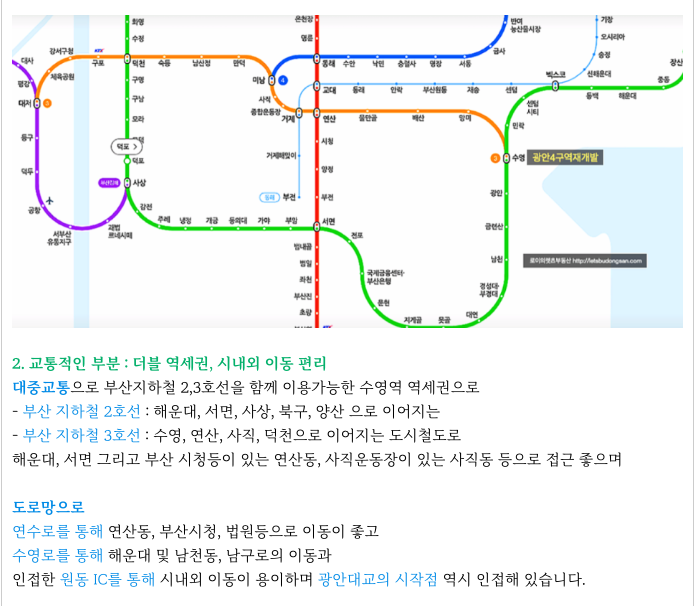 - 수영역 더블 역세권 : 부산 지하철 2호선, 3호선 환승센터.
