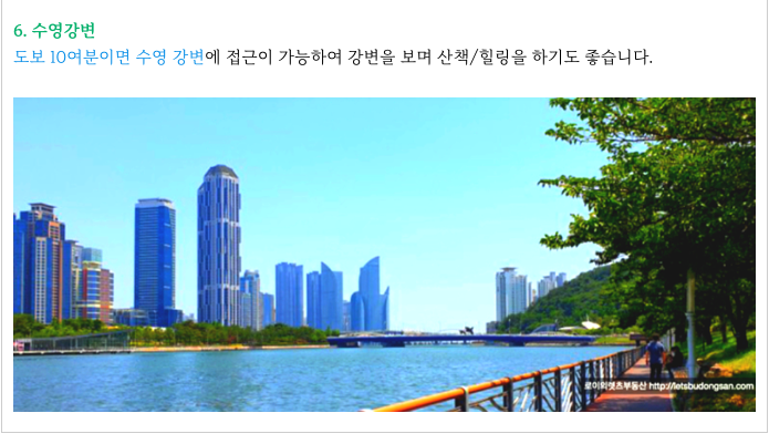 해운대와 수영을 따라 흐리는 수영강변이 도보 15분여 거리에 있으며