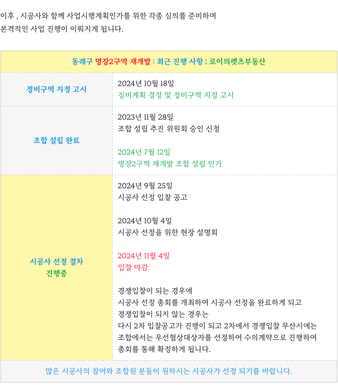 동래구 명장2구역 재개발 일자별 진행 정리 및 이후 절차, 일정 등 추가 정보는 아래 페이지를 참고 부탁드립니다.
