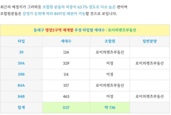 명장2구역 재개발 계획 타입별 세대수 정리하였습니다.