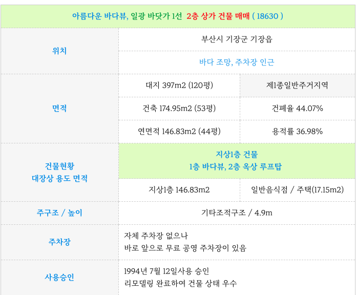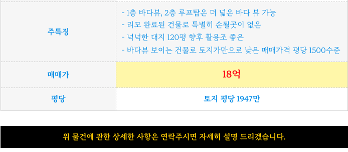 - 바다뷰 보이는 건물로 토지가만으로 낮은 매매가격 평당 1500수준
