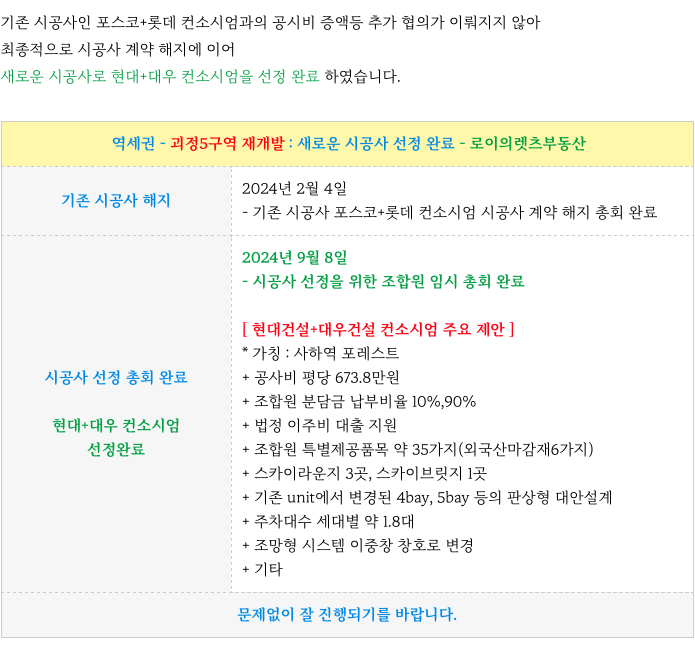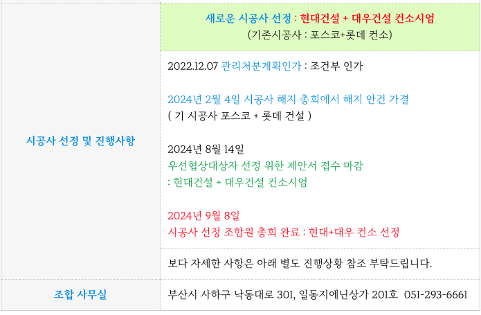 시공사 변경 선정까지 완료 함으로 이제 다시 진행이 풀리고 있습니다.