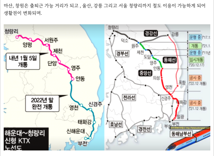 마산, 창원 30여분 그리고 동해를 거쳐 서울까지 이용가능한 철도가 개통예정에 있으며