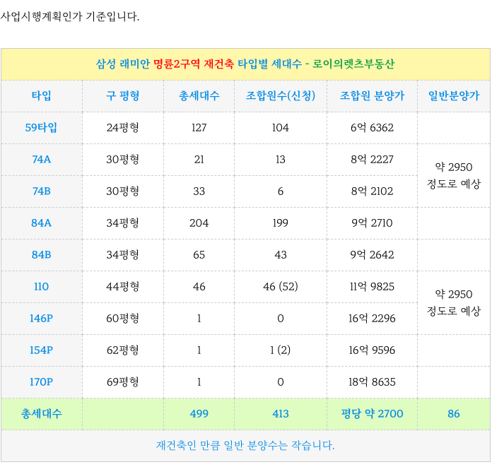 * 재건축의 특성상 일반 분양 수익이 작아 내집을 새롭게 짓는다라는 것이 기본이며
