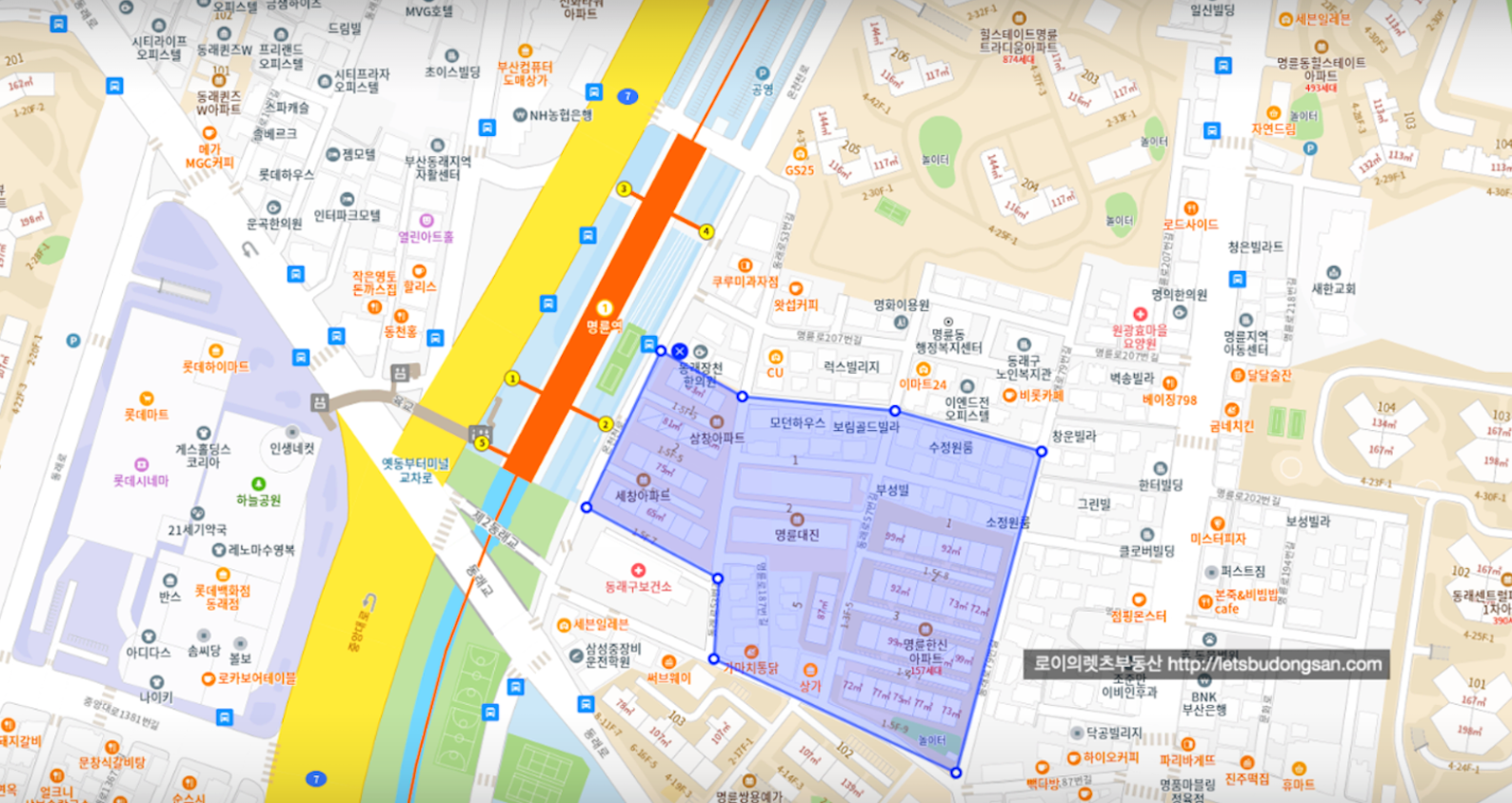 부산 핵심 상권중 하나인 동래역 상권과 연결되어 많은 병원, 상가들 이용이 편리하며