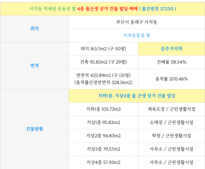 사직동 역세권 4층 올근생 상가 건물 빌딩 매매 물건 정보 소개해 드리겠습니다. ( 물건번호 27250 )