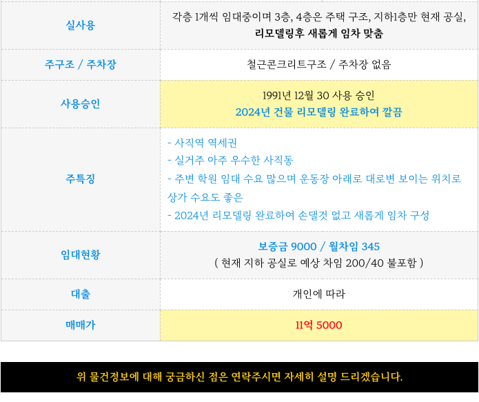 3) 2024년 건물 전체 리모델링 진행하고 새롭게 세입자를 맞춰 특별히 손볼것이 없는 매물 입니다.