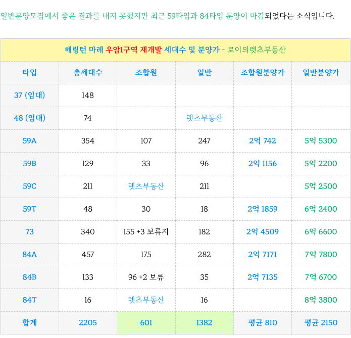 우암1구역 재개발 - 해링턴 마레 각 타입별 세대수, 분양가 소개해 드리겠습니다.