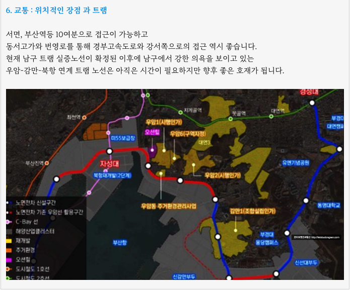 우암1, 우암2, 감만1 로 이어지는 신축 대단지 예정지에서 가장 최상단에 있어 접근이 좋고