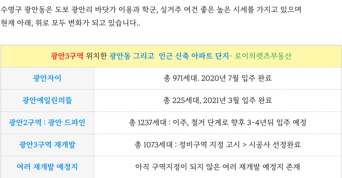 | (수영구) 드파인광안 = 광안2구역 재개발 - 조합원 입주권 매물 & 분양권 비교 (0) | 2024.10.30 |