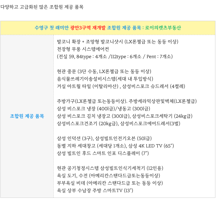 광안3구역 재개발 조합원 특별 제공 품목 정리하였습니다.
