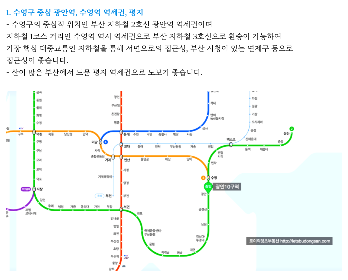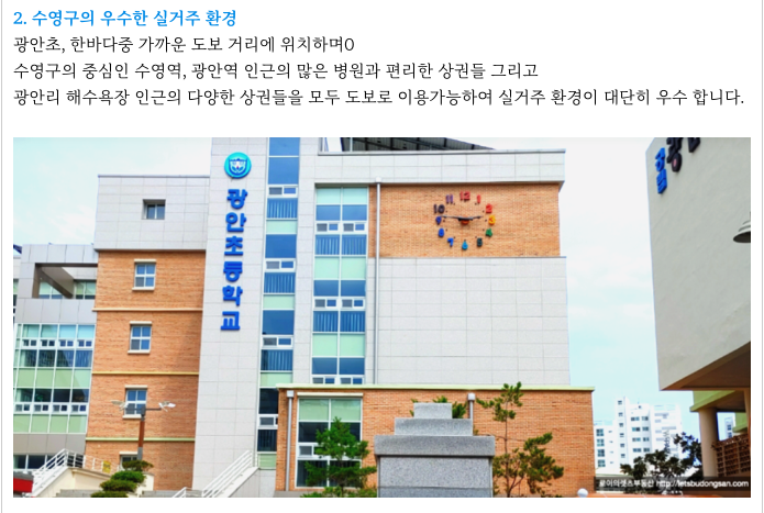 - 수영구 중심 광안동, 광안리 해수욕장, 주변시세 높은