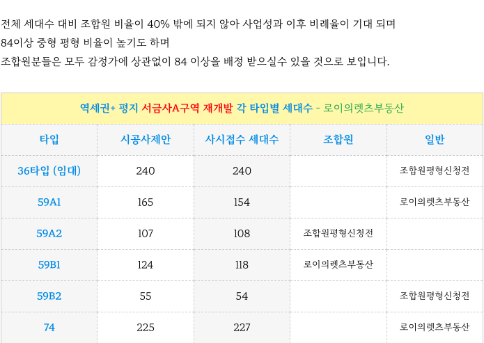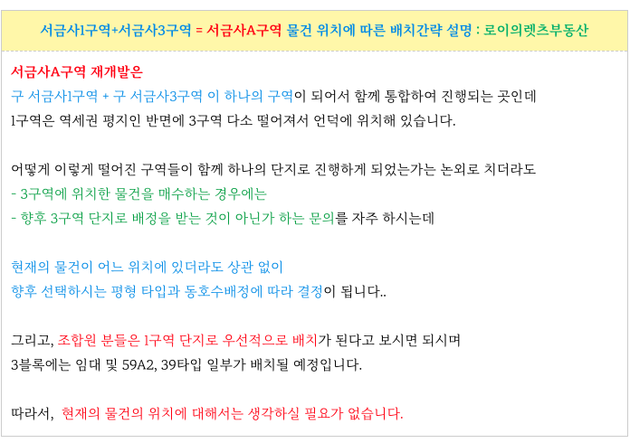 각 매물의 위치헤 따라 향후 조합원 배치가 되는지 문의가 자주 있기도 합니다.