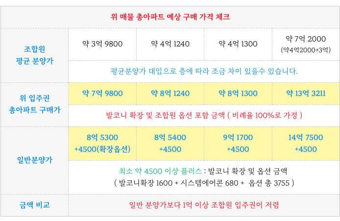 조합원 입주권이 일반 분양권보다 1억 이상의 가격 차이를 보이고 있어 가격적 메리트가 있습니다.