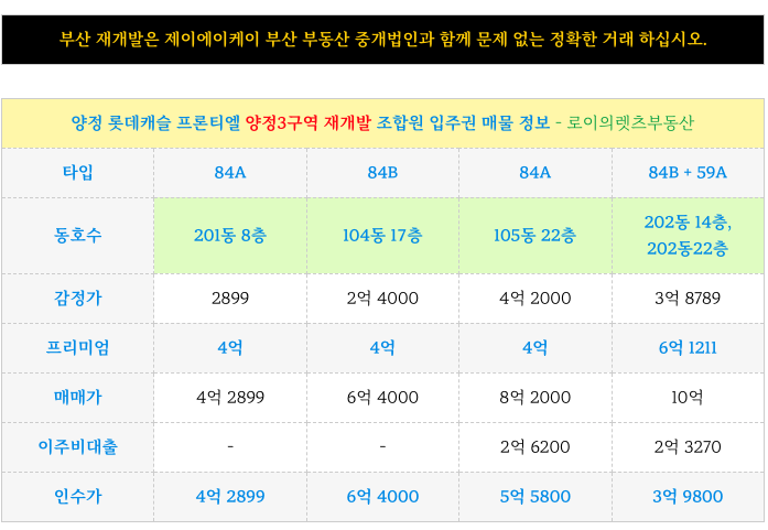 양정롯데캐슬프론티엘 : 양정3구역 - 조합원 입주권 84타입 매물