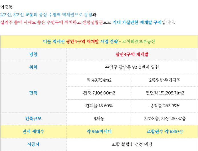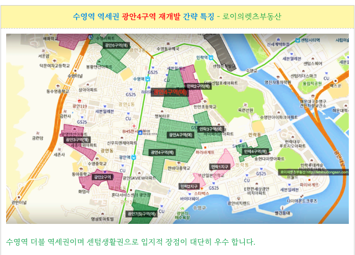 광안4구역 재개발 설명드린 입지적 주요 특징 간략 다시 정리하였습니다.