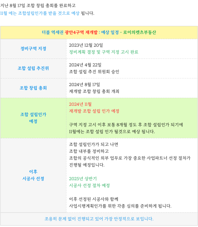 수영구 광안4구역 초기부터 지금까지 주요 진행 사항 & 향후 절차 일정등 추가 정보는 아래 페이지를 참고 부탁드립니다.