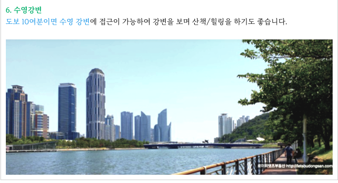 해운대와 수영을 가로지르며 흐르는 수영강변이 도보 15분여 거리에 있고