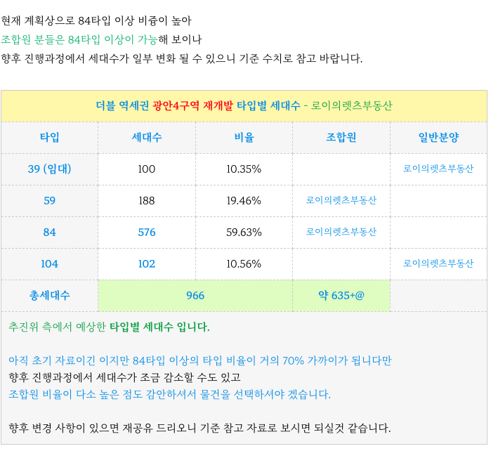 수영역 광안4구역 현계획 타입별 세대수 소개 드립니다.