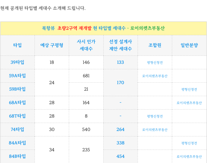 향후, 84타입 이상 세대수 늘리는 설계변경을 계획하고 있어 일부 세대수 변경이 있을 예정입니다.