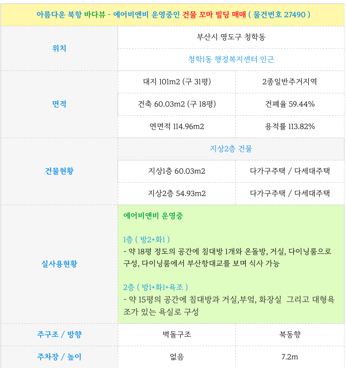 부산 영도 청학동 바다뷰 2층 꼬마 건물 빌딩 매매 물건 제원 소개해 드립니다