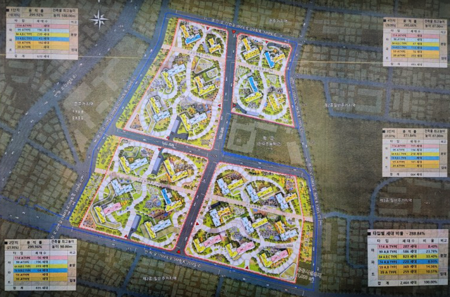 최초 2600여세대에서 40평대 비율들을 늘리면서 세대수는 조금 감소하였습니다.