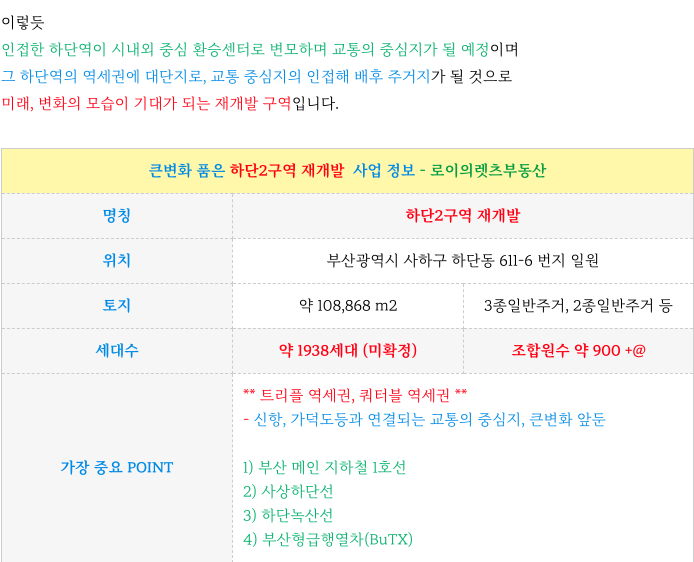 배후 주거지로 주거 수요 증가 등 하단역 주변의 큰 변화가 기대가 되고 있습니다.