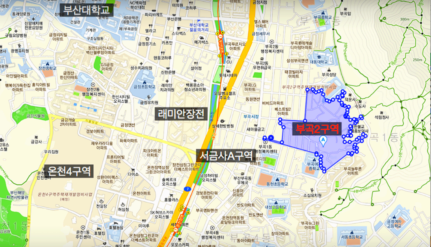 구역 바로 아래 부곡시장과 많은 상가들이 밀집해 있으며