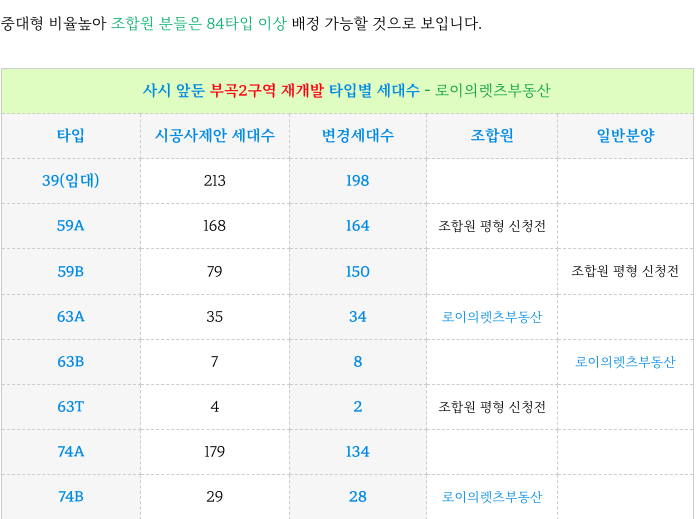 대단지 부곡2구역 사시 고시 기준 타입별 세대수 정리하였습니다.