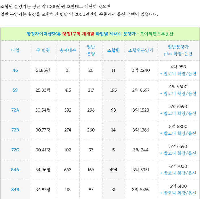 양정자이더샵SK뷰 각 타입별 세대수 그리고 분양가도 정리해 드립니다.