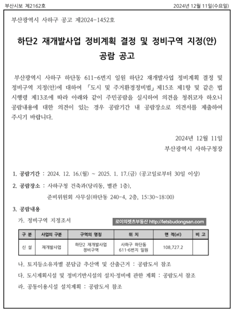 하단2구역 재개발은 12월 16일부터 구역지정 공람이 시작될 예정입니다.