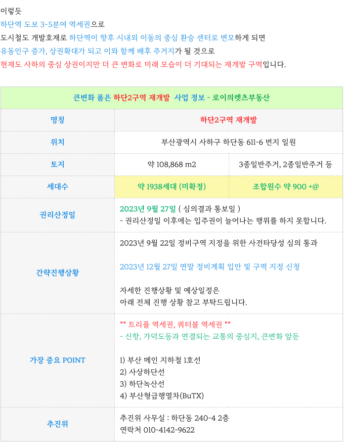 부산 전역 재개발에 대해 궁금하신 점은 방문 또는 연락주시면 자세히 설명 드리겠습니다.