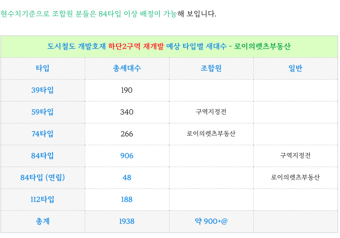 하단2구역 재개발 현재기준 각 타입별 세대수 소개해 드리겠습니다.