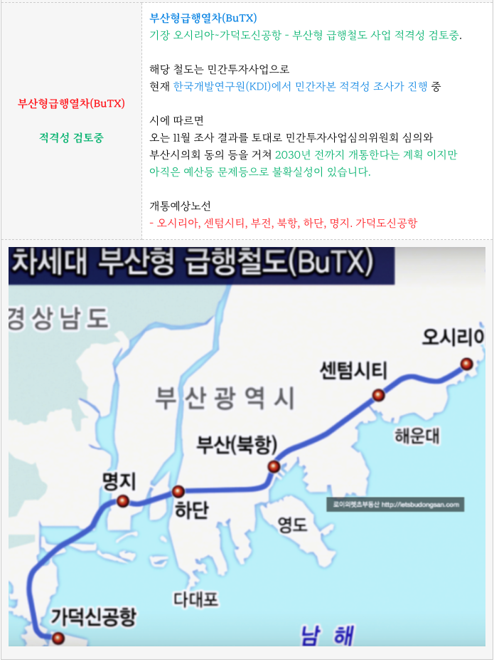 4) 부산형급행열차 (계획중) : 오시리아에서 가덕신공항으로 연결되는 지하 대심도 열차 KDI 적격성 심의 중