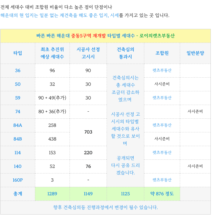 중동5구역 재개발 현 계획 타입별 세대수 소개해 드리겠습니다.