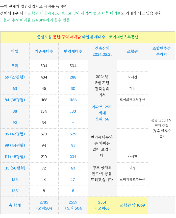 도심역세권 문현1구역 현재 계획되어 있는 각 타입별 세대수 입니다.