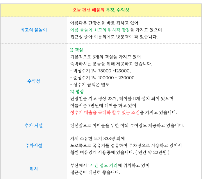 현재까지 주인분께서 운영하고 계신 펜션으로 그대로 인수받아 바로 운영하실수 있는 물건입니다.