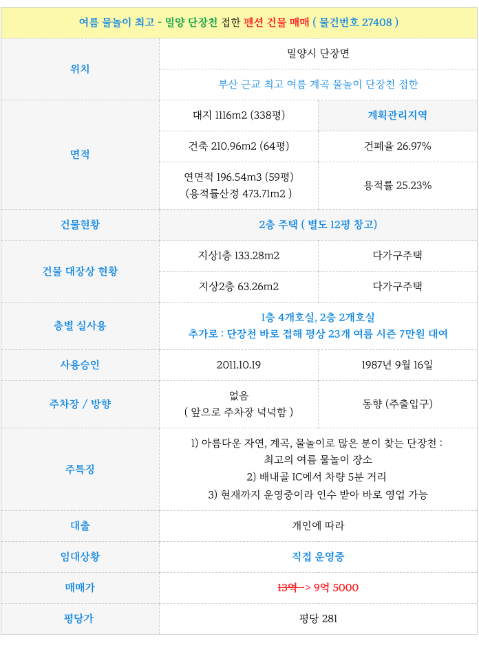 여름 물놀이 최고 - 아름다운 밀양 단장천 접한 펜션 건물 매매