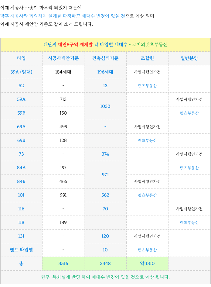 대단지 대연8구역 계획된 타입별 세대수 정리하였습니다.