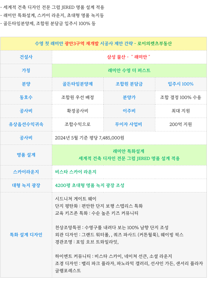 광안3구역 재개발 시공사 삼성물산의 주요 제안 부분 소개해 드리겠습니다.