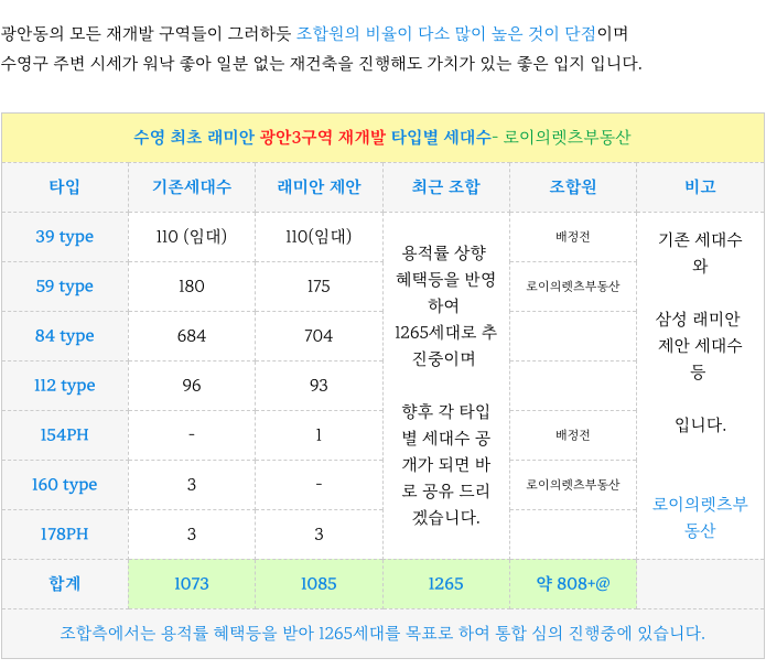 광안3구역 재개발 추진중인 타입별 세대수 소개해 드리겠습니다.