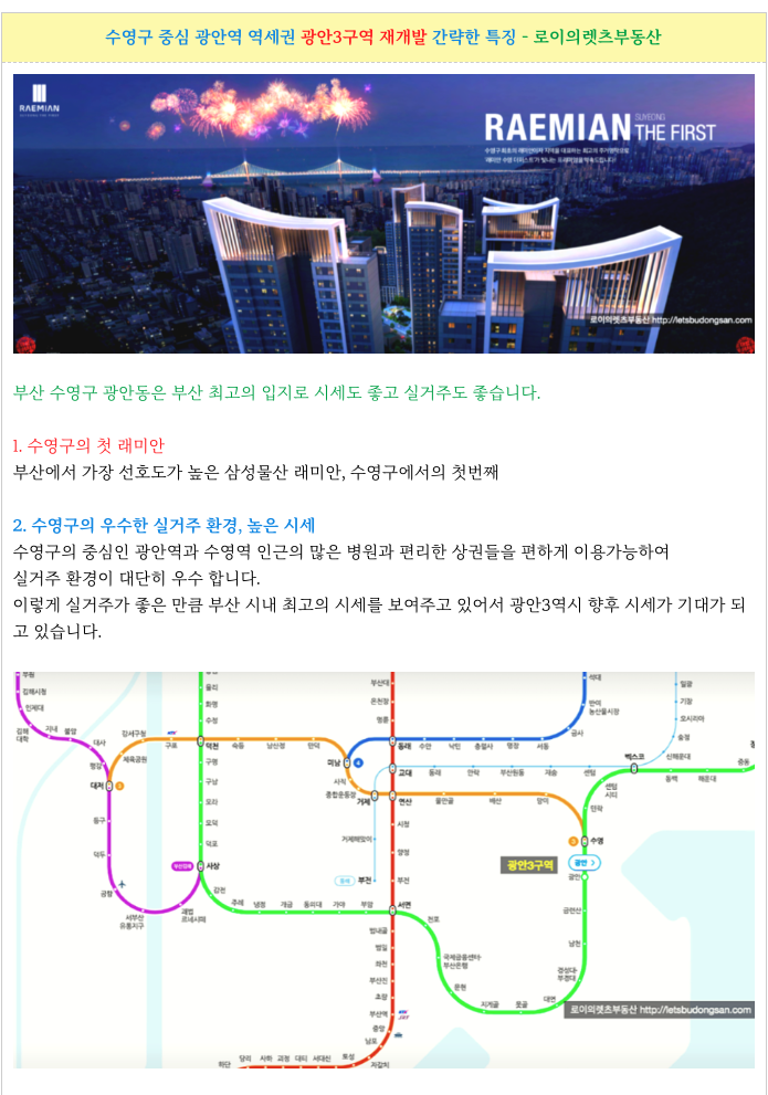 안녕하세요 로이의렛츠부동산 ( JAK 제이에이케이 부산 ) 입니다. 오늘은 수영구 최초 래미안 광안3구역...