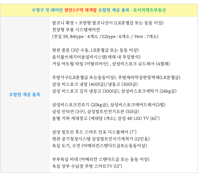 광안3구역 재개발 고급스럽고 다양한 조합원 제공 품목 소개해 드리겠습니다.