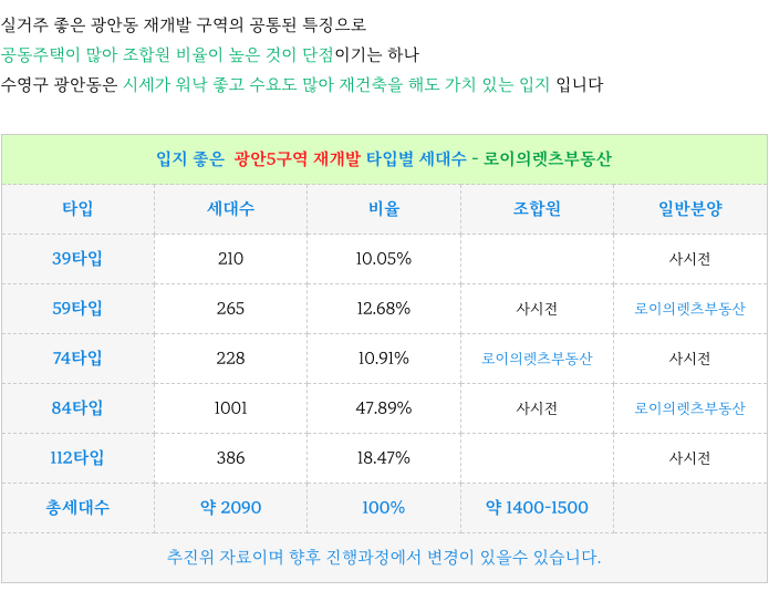 광안역 역세권 광안5구역 현재 타입별 세대수 정리 드립니다.