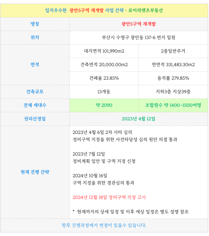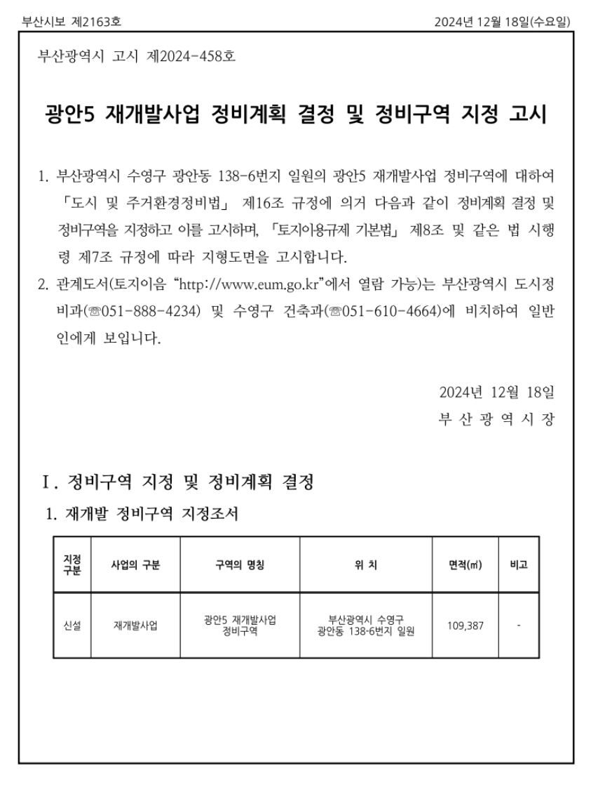 광안5구역 재개발은 12월 18일 정비구역 지정 고시가 완료되었습니다.