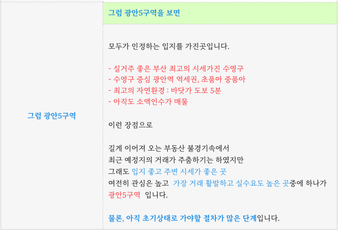 광안5의 입지는 누구나 동의하는 곳이며 구역 지정도 임박하여 상대적 불확실성도 작은 곳 입니다.