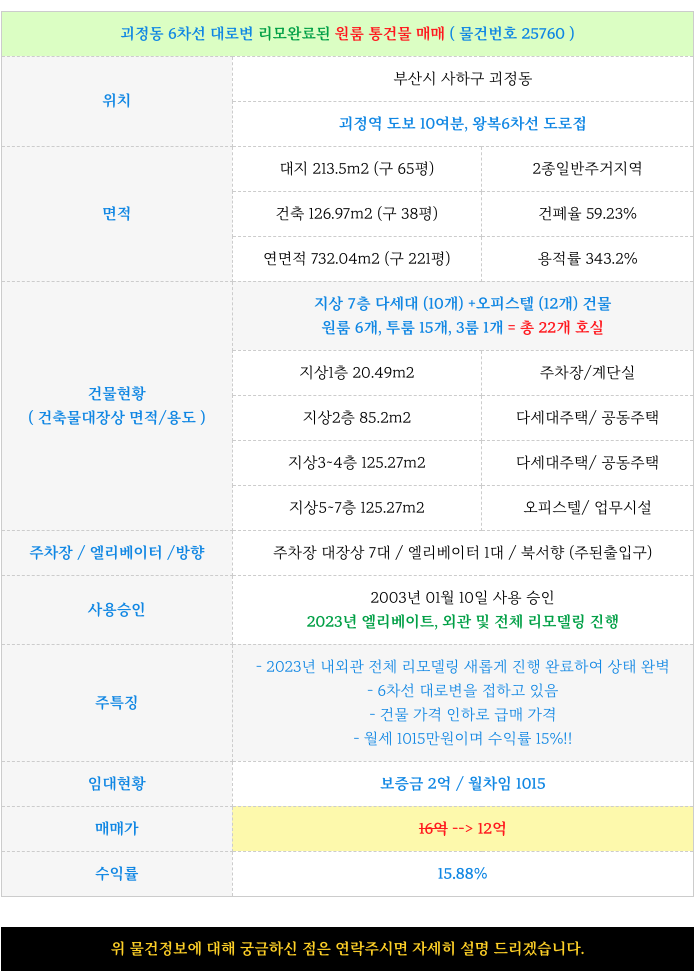 첫번째 ) 괴정동 6차선 대로변 리모완료된 원룸 통 건물 급매 ( 물건번호 25760 )