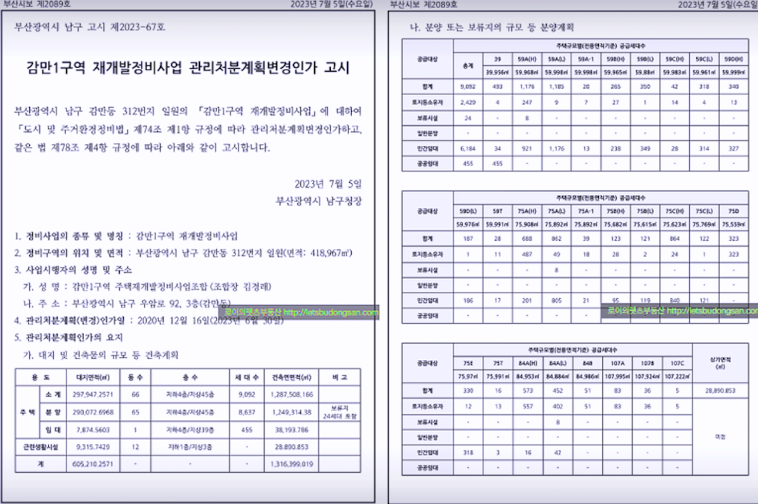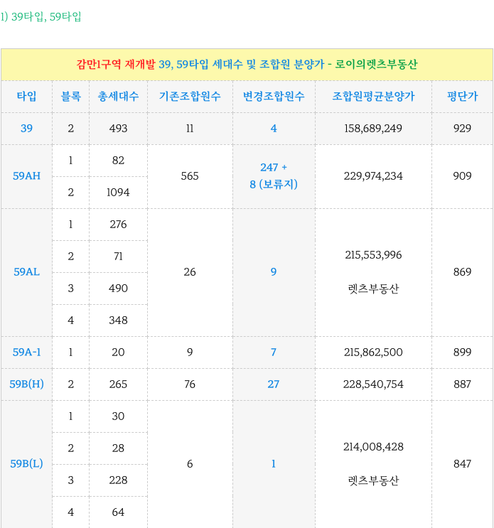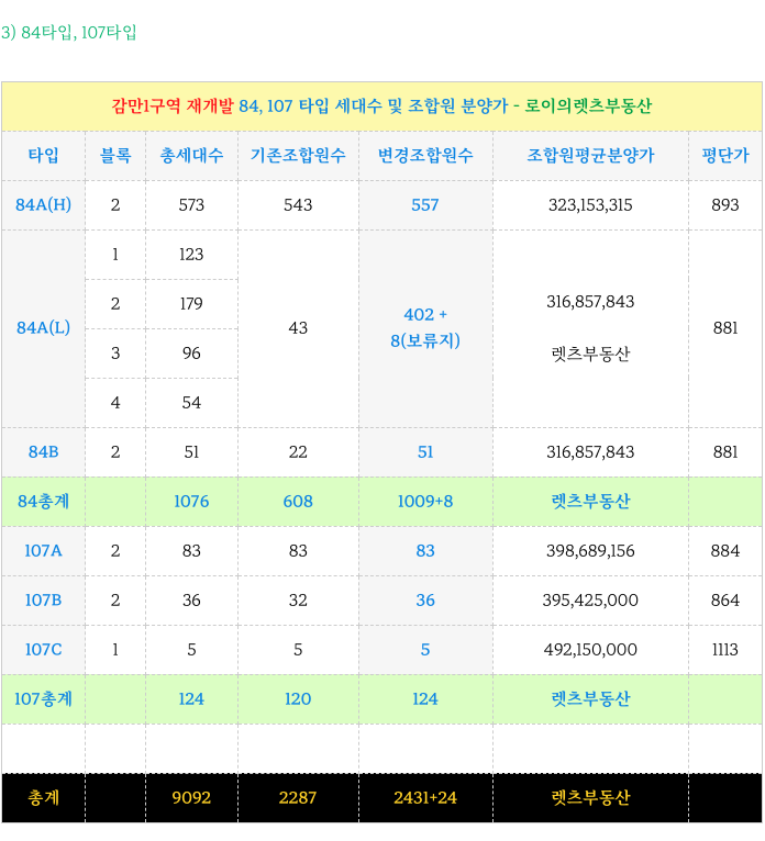 감만1구역 재개발 각 타입별 세대수 그리고 조합원 분양가 소개 드립니다.